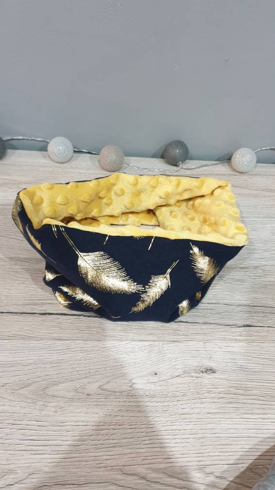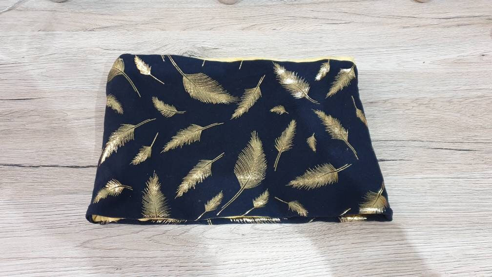 Reversible, one side in minkie yellow comforter relief fabric and one side in navy blue jersey with golden leaves.