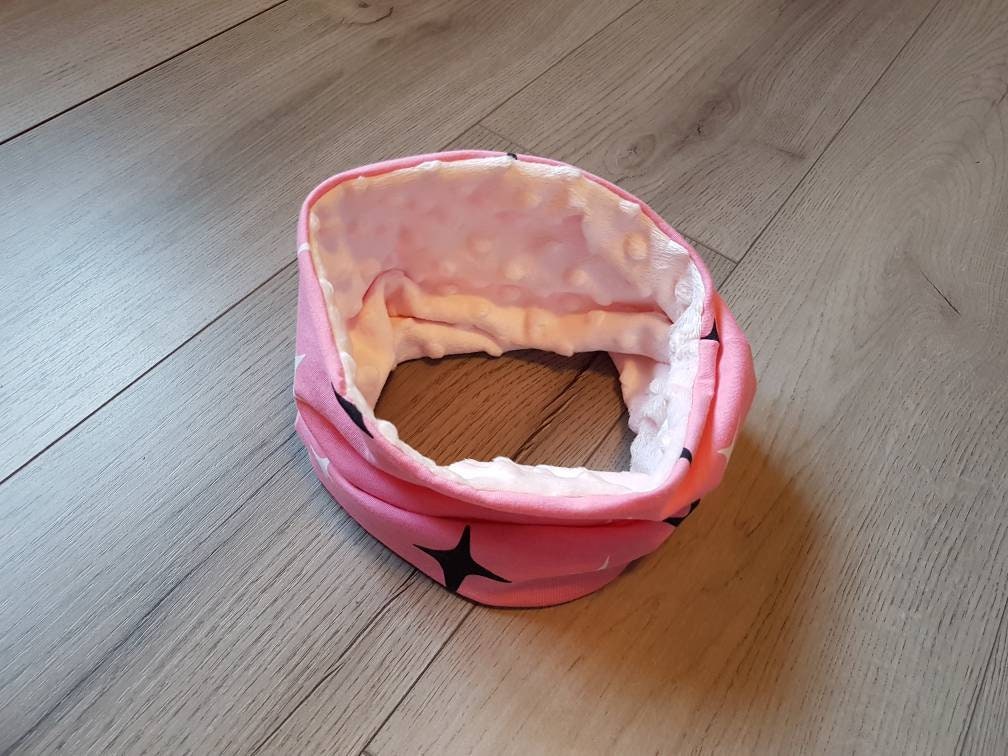 Reversible, a side in minkie fabrics relief pink soft and a side in pink jersey to stars.