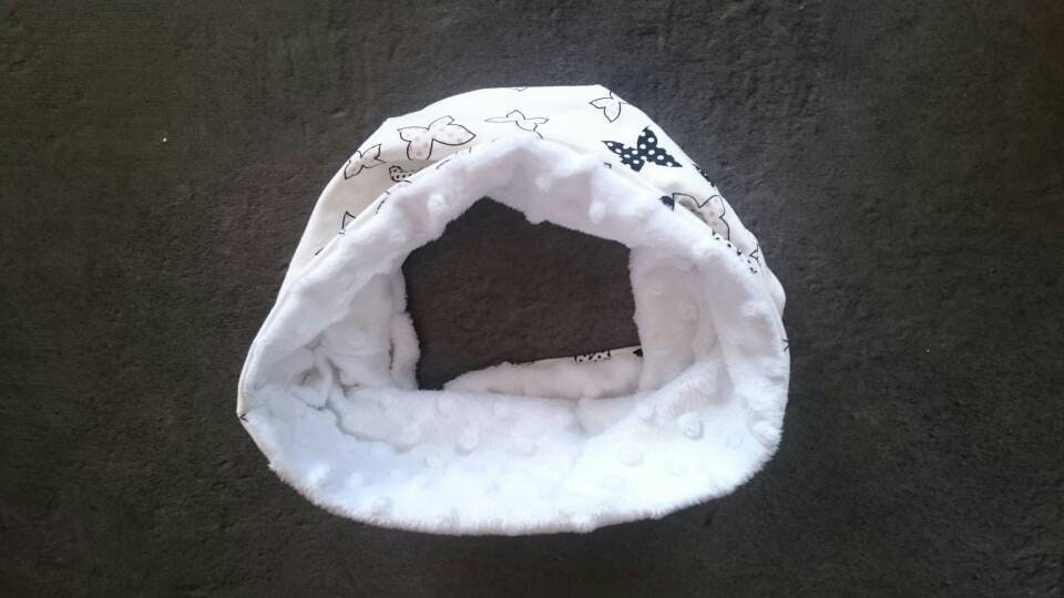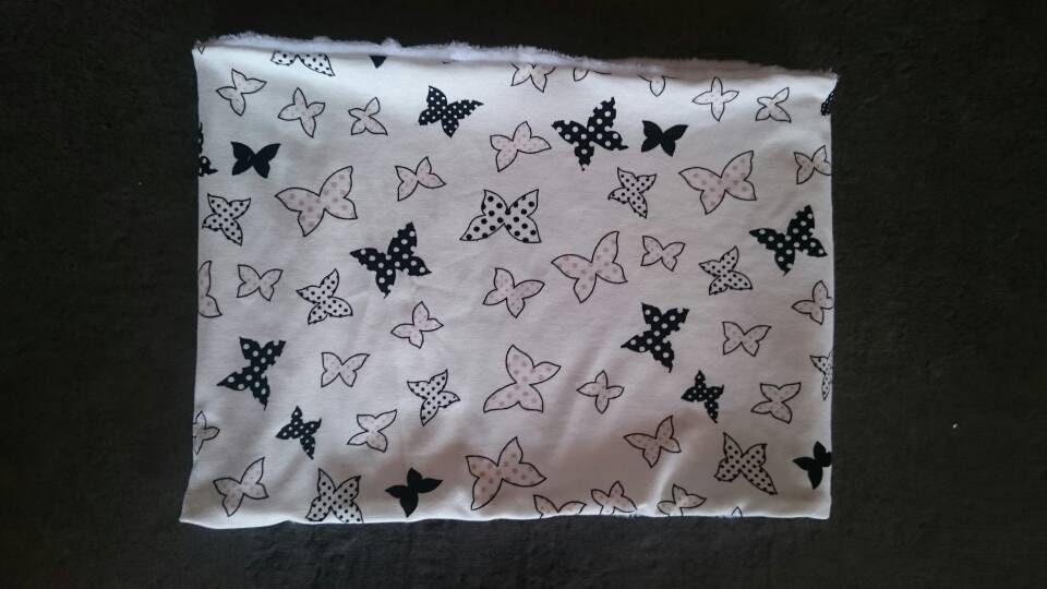 Reversible, a side in minkie fabrics relief soft white and a side in off-white jersey with butterflies 😀.