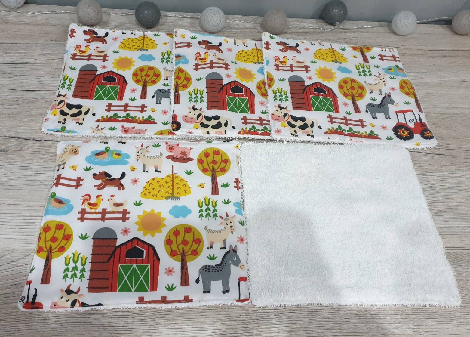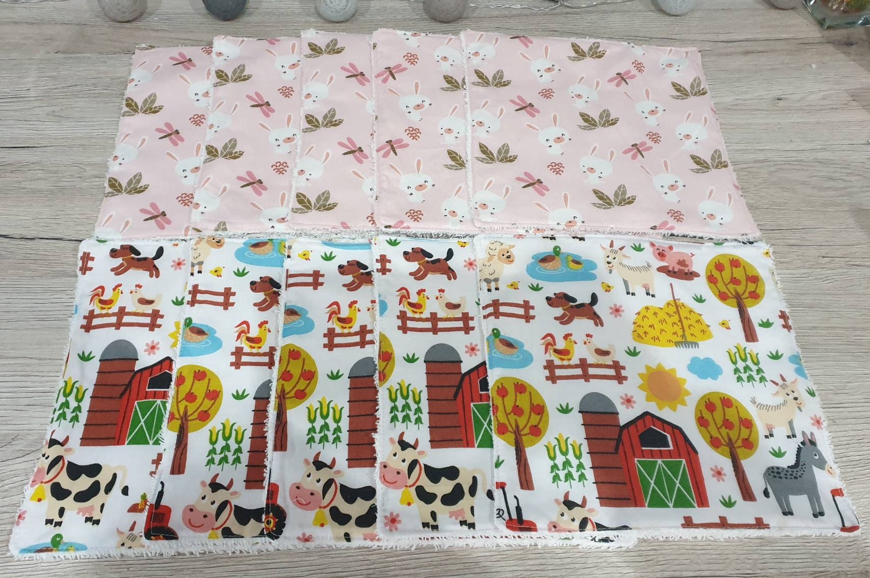 They are made of cotton with farm and little rabbit patterns.